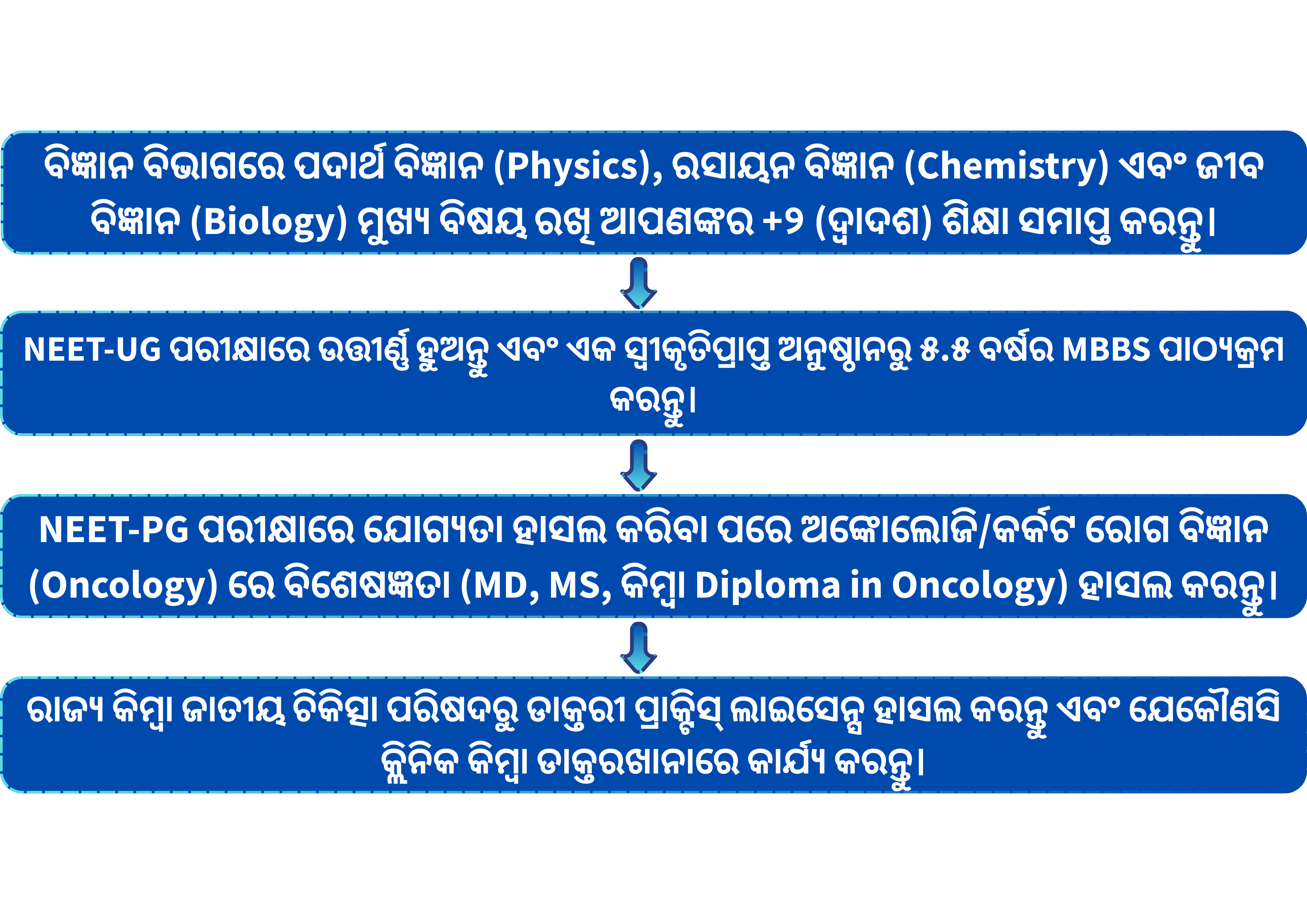 ଜଣେ କର୍କଟ ରୋଗ ବିଶେଷଜ୍ଞ (ଅଙ୍କୋଲୋଜିଷ୍ଟ) ନିଜର ଚିକିତ୍ସା ଶିକ୍ଷା ସମାପ୍ତ କରି ଏବଂ କର୍କଟ ରୋଗ ଚିକିତ୍ସାରେ ଅଭିଜ୍ଞତା ହାସଲ କରି ନିଜସ୍ୱ କ୍ଲିନିକ୍, ହସ୍ପିଟାଲ୍ କିମ୍ବା କର୍କଟ ସମ୍ବନ୍ଧୀୟ ଷ୍ଟାର୍ଟଅପ୍ ଆରମ୍ଭ କରି ଜଣେ ଉଦ୍ୟୋଗୀ ହୋଇପାରିବେ । ସେମାନେ ନୂତନ ଚିକିତ୍ସା ପଦ୍ଧତି, ରୋଗ ଚିହ୍ନଟ ପ୍ରକ୍ରିୟା (Screening) କିମ୍ବା ରୋଗୀ ସହାୟତା ସେବା ଉପରେ କାର୍ଯ୍ୟ କରିପାରିବେ । ବ୍ୟବସାୟିକ ଦକ୍ଷତା ଏବଂ ସରକାରୀ ସହାୟତା ମାଧ୍ୟମରେ ସେମାନେ ନିଜର ଚିକିତ୍ସା କେନ୍ଦ୍ରକୁ ଏକ ବଡ଼ ସ୍ୱାସ୍ଥ୍ୟ ସଂସ୍ଥାରେ ପରିଣତ କରିପାରିବେ ।
